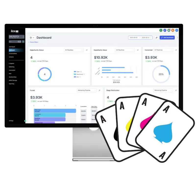 The Deck was created by Ace after years of building strategies for clients and constantly juggling disconnected tools. Clients had marketing campaigns living in one platform, sales pipelines in another, and automation, if any, patched together in between.